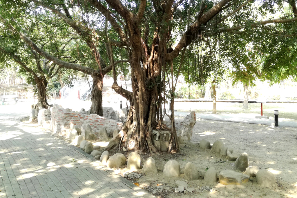 I got this inspiration of the ship from the burning ship festival held once every three years in Donggang and wave-like women’s dancing in the circle at the Alizu Night Festival of the Siraya tribe. By making the ships symbolizing these two, We revive the sacred place in Madou. I dug up the old red bricks that are also included sugar factory’s bricks 100 years ago from the forest and made a ship that has a sugar making stone and a banyan tree as a stern using old bricks and the ancient cement. The red brick is a material that symbolizes the history of the sugar industry in Madou.