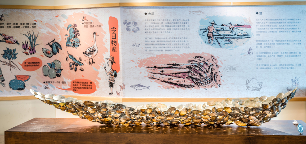 倒風内海故事館の敷地内にある、古代埠頭遺跡の鳳凰の池で沼貝の殻に出会いました。麻豆の貝殻は外側は泥の色ですが、内側は真珠のように輝いていました。その貝殻で舟をつくった。麻豆地区は農業によって大地と共に生きる土色の中に真珠のように豊かな文化を持っていることを象徴する舟です。