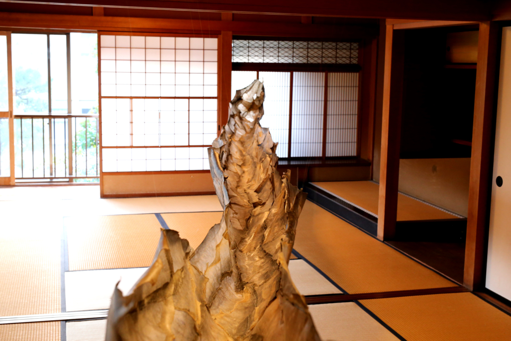 太古シナヌと呼ばれた信濃の国からやってきた作家は、長野県では千曲川と呼ばれる信濃川で繋がる新潟市のゆいぽーとに3か月間滞在し、信濃川の痕跡を遡上するように、縄文文化と土地の歴史、民俗のリサーチを行いました。今回、縄文土器の表現の中で最も優れた造形性を持つ火炎型土器の造形は平安時代には数万匹の鮭が遡上していたという信濃川の川面を跳ねる鮭の姿ではないかという直感をもとに、その豊かな恵みをもたらす鮭の皮を用いて、舟を作りました。海から、生まれた川へと帰ってくる鮭の婚姻色は炎のように赤いです。
