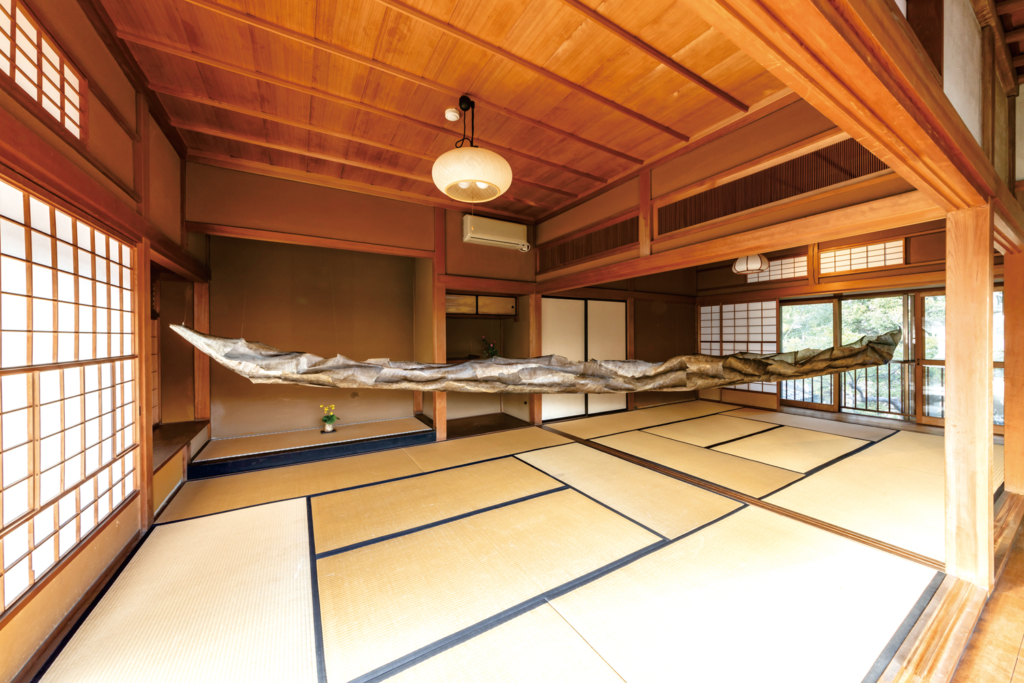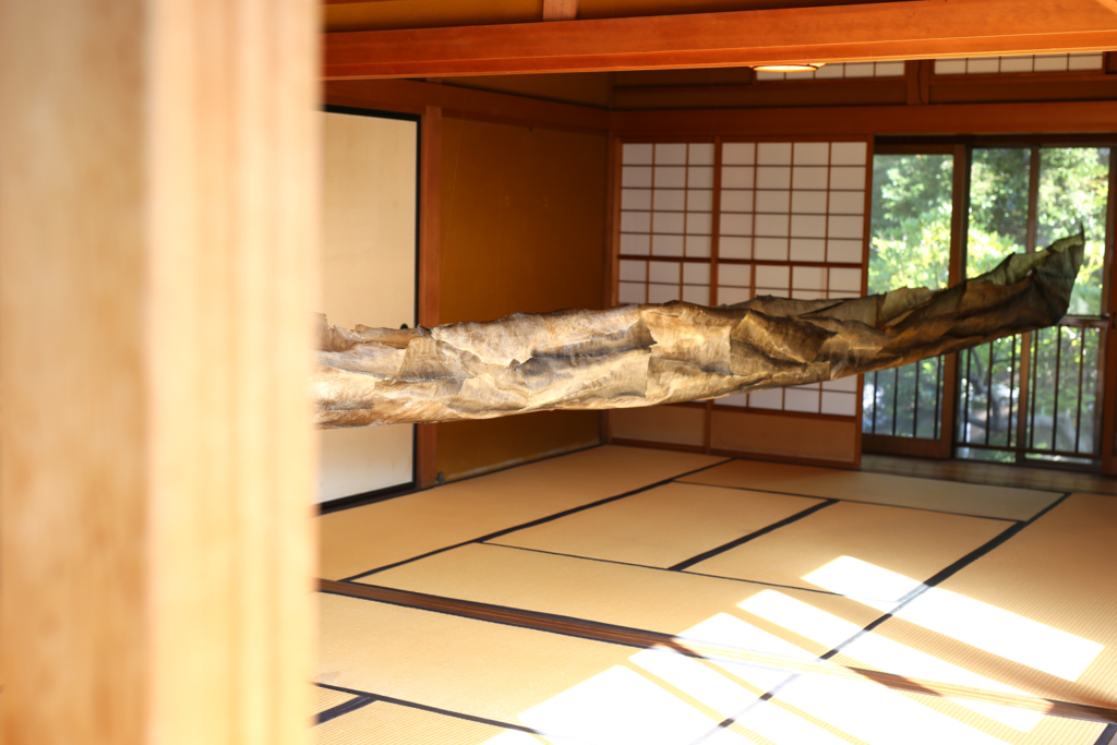 Salmon skin, waxed cotton linen thread, fishing line / H0.8m×W0.5m×D8m / YUI-PORT 2020 Autumn AIR Invitation Program / Sakyukan / Niigata / 2020