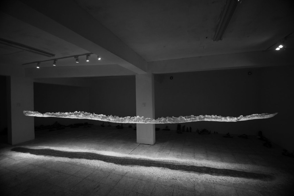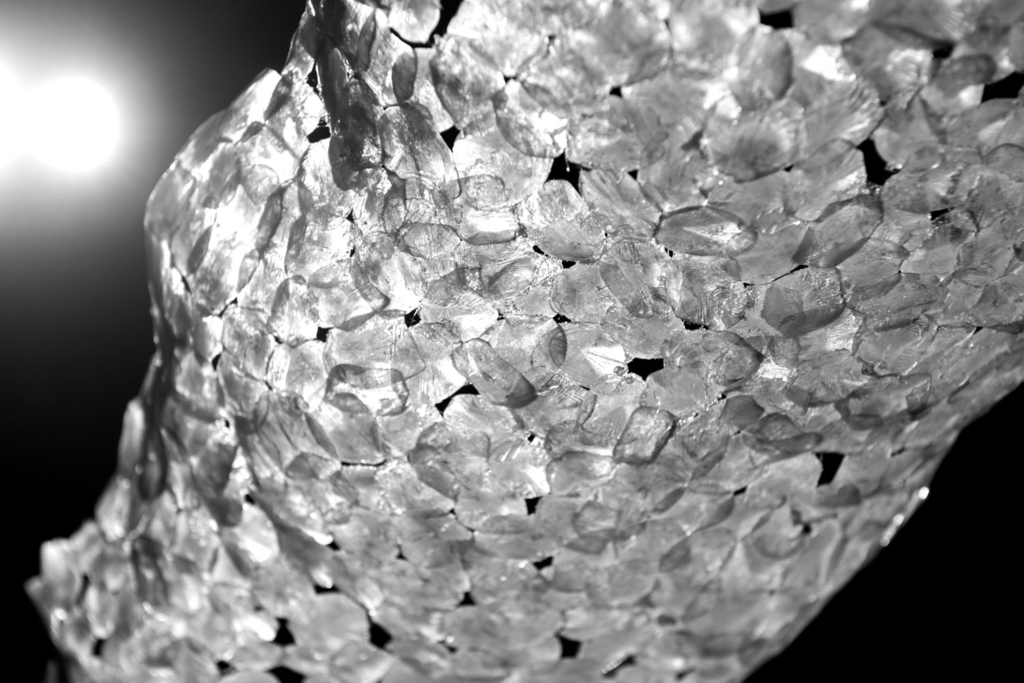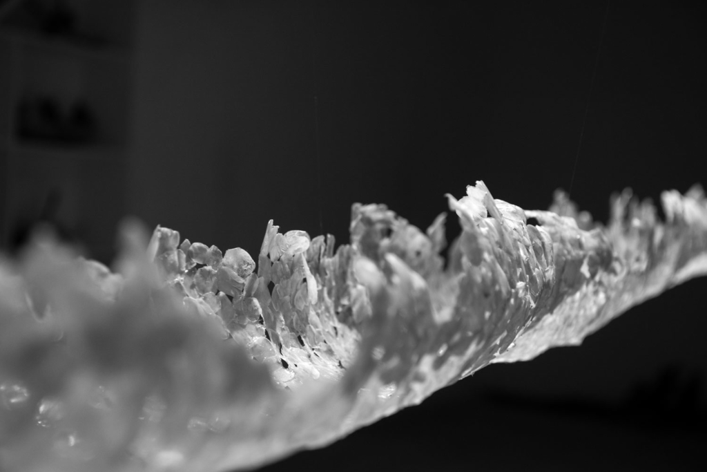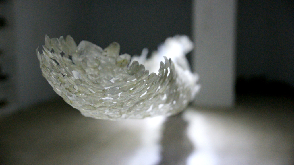 I made a ship using Hualien’s fish scales. Its shape is like the marble cave dug and scraped by the river in Taroko Valley, like the undulating white waves in the Hualien east coast, it is tracing the great natural form in Hualien. It is the ship by the fish scales like petals of ice crystals.