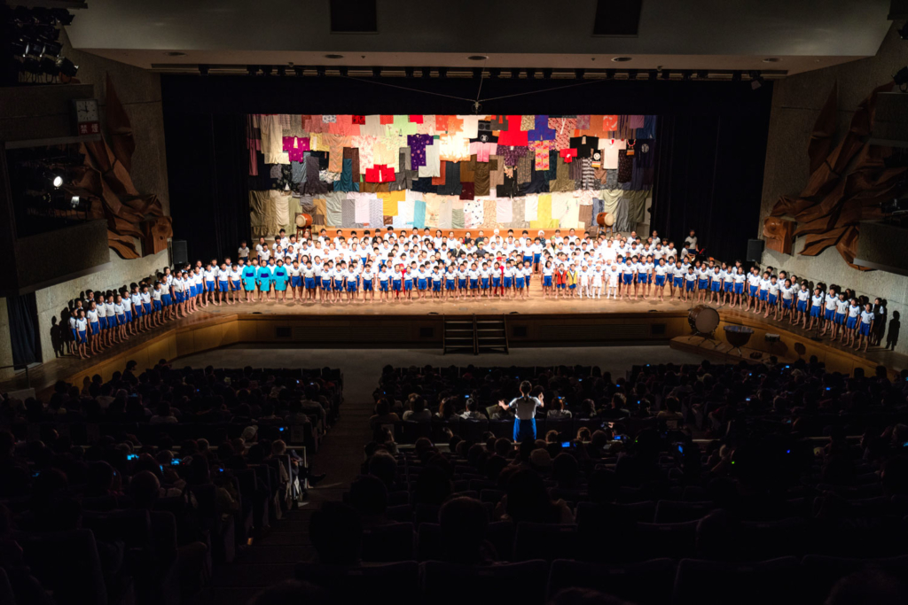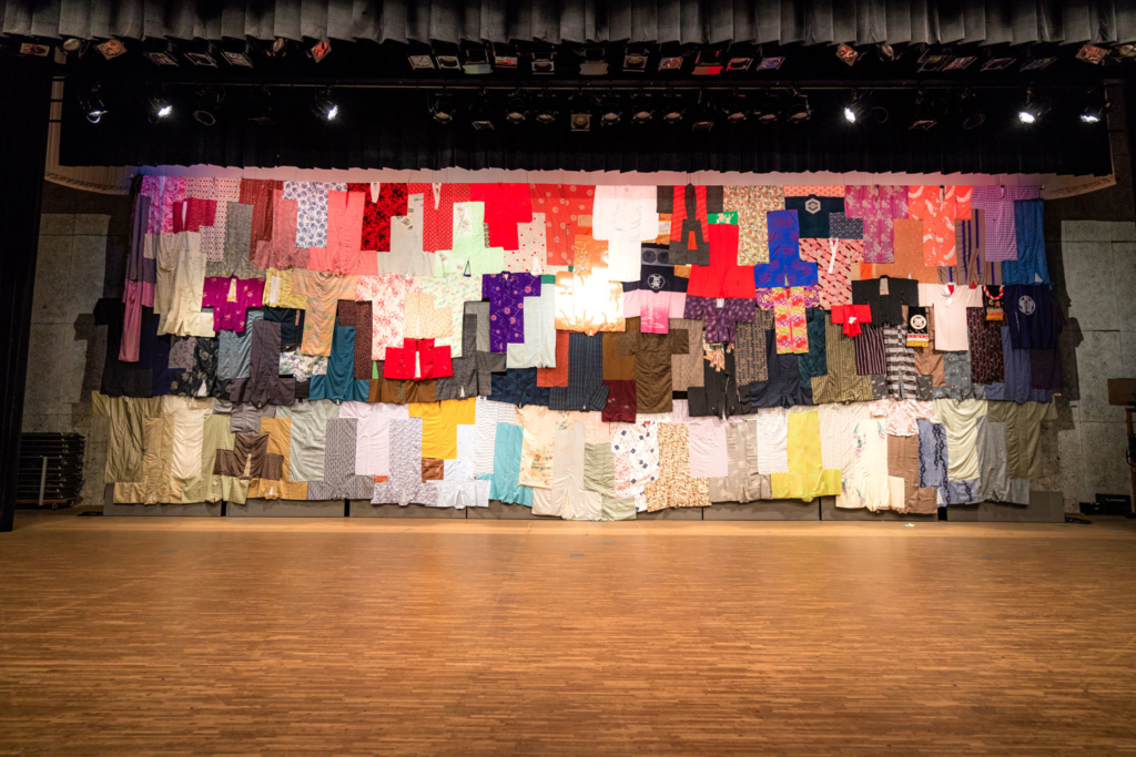 37年間の歴史を持つ遠野小学校全校表現活動の舞台美術を担当、およそ100着の古着物を遠野の方とワークショップで大幕に縫い上げた。